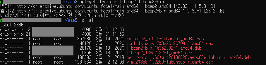 apt-get download 명령어는 현재 디렉토리에 .deb 형태로 필요한 패키지를 다운로드 받는다.