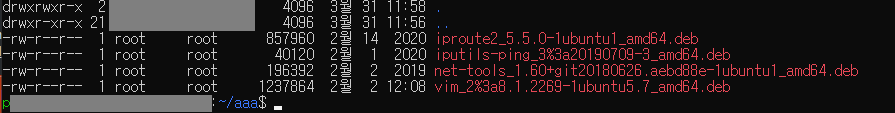 aaa라는 임시 폴더를 만들어 내부에 필요한 deb 들을 설치했다.